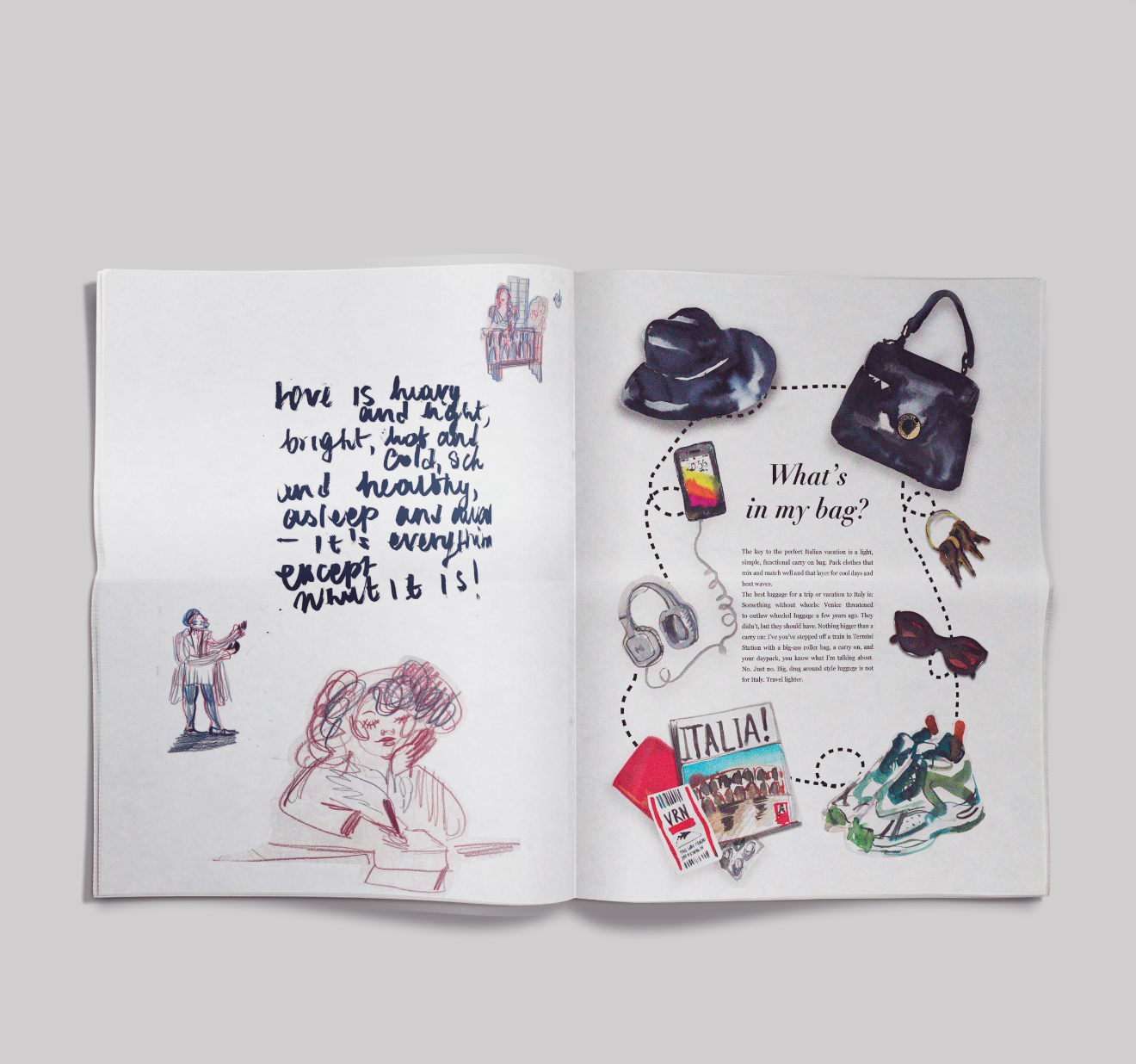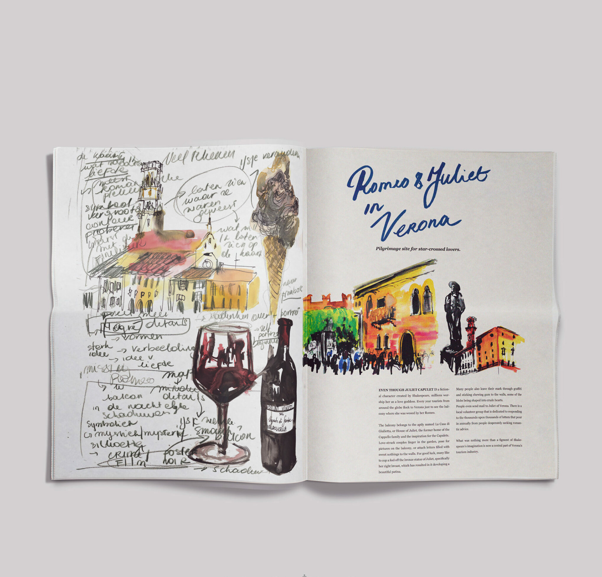 I created an illustrative newspaper using mixed media, focusing on Verona, the romantic setting famously associated with Romeo & Juliet.