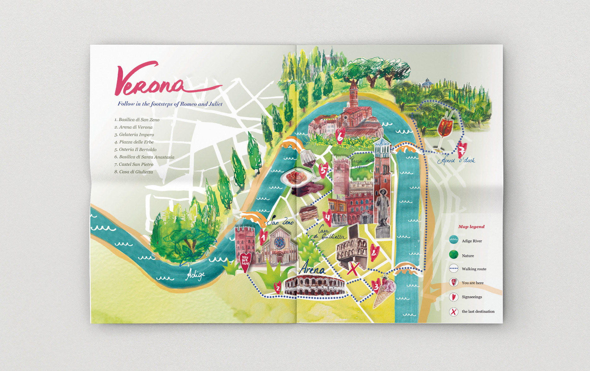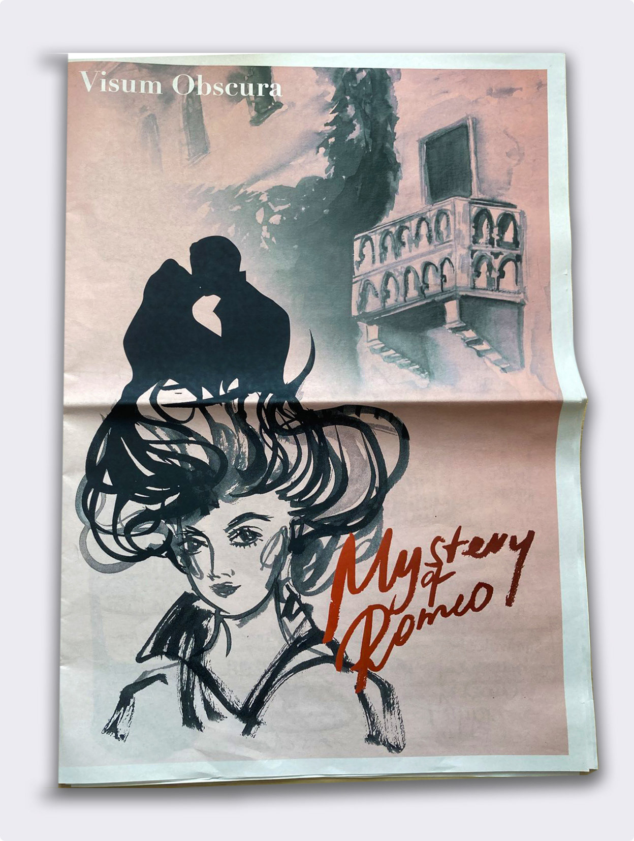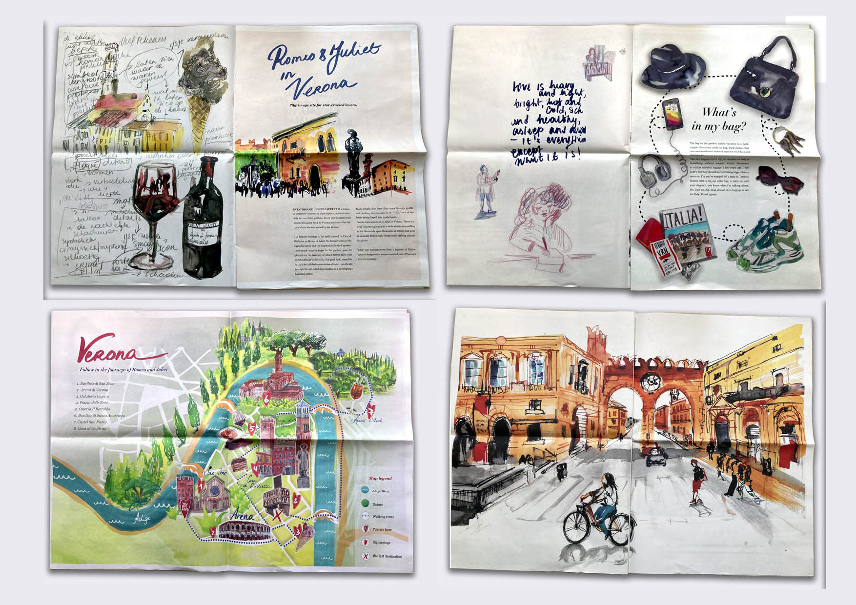 I created an illustrative newspaper using mixed media, focusing on Verona, the romantic setting famously associated with Romeo & Juliet.